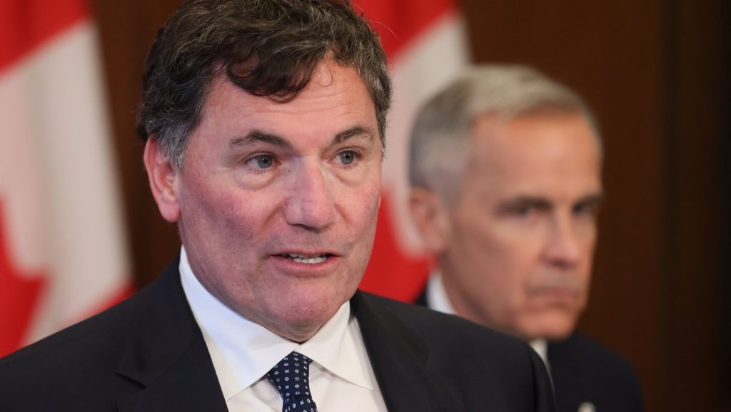 [caption id="attachment_204716" align="alignleft" width="318"] Президент Королевского тайного совета Канады Доминик Леблан выступает на пресс-конференции, которую слушает премьер-министр Марк Карни, на…