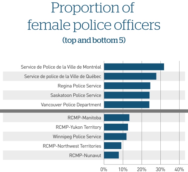 Наименьшее число дам журналисты насчитали в полиции Виннипега – их пропорция там равна менее 15 процентам.