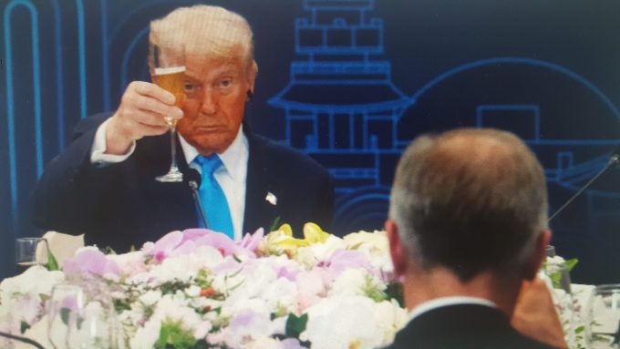Во время ужина с лидерами других стран президент США Дональд Трамп смотрит на премьер-министра Марка Карни, в то время, когда они поднимают бокалы во время тоста. Кёнджу, Южная Корея, среда, 29 октября 2025 года. THE CANADIAN PRESS/Adrian Wyld