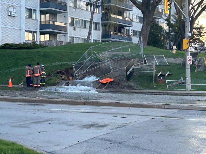 20 апреля 2026 года полиция Торонто была вызвана на перекресток Нильсон Драйв и Дандас Стрит Вест после сообщений о прорыве водопровода. Фото: Джанкарло ДеСантис/CityNews