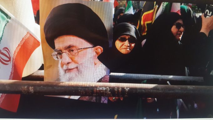 Демонстранты держат плакат с изображением верховного лидера Ирана аятоллы Али Хаменеи и иранский флаг во время ежегодного митинга перед бывшим посольством США в Тегеране, посвященного годовщине захвата посольства в 1979 году. Иран, вторник, 4 ноября 2025 года. Фото: AP/Vahid Salemi (Vahid Salemi)