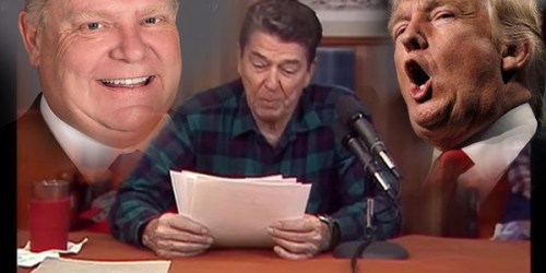 Затем он снова впал в ярость из-за телевизионной рекламы провинции Онтарио, в которой указывалось, что его политический кумир Рональд Рейган яростно выступает против торговых пошлин.